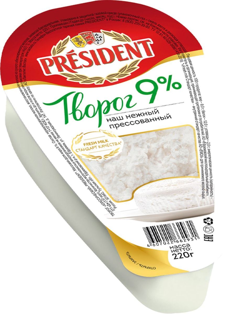 - Нежный творог President Он является неотъемлемой частью здорового рациона. Творог President замечательно подходит как для самостоятельного блюда, так и для приготовления различной выпечки (сырников, запеканки).Состав: нормализованное молоко, восстановленное молоко из сухого обезжиренного молока, закваска бактериальная.